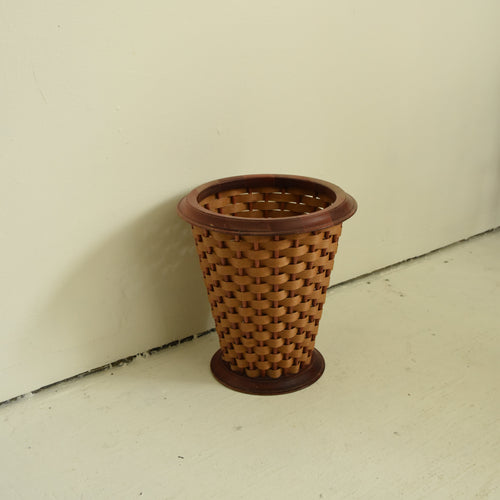 Vintage Handmade Scrap Quilt Fabric Basket with Wooden Handles